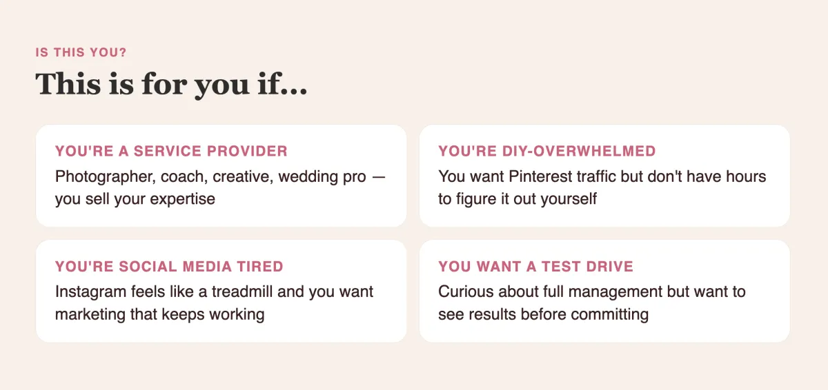 A strategic, done-for-you clean-up that turns your Pinterest into a client-attracting search engine and visibility machine.